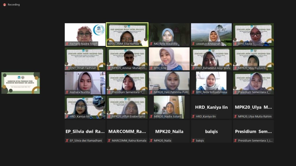 Ciputat, Berita Fikes Online – Health Care Management Student Association (HACAMSA) salah satu Organisasi Peminatan dan Keilmuan Fakultas Ilmu Kesehatan (Fikes) Universitas Islam Negeri (UIN) Syarif Hidayatullah Jakarta mengadakan Evaluasi Akhir Tahun (EAT) melalui zoom meeting. EAT dilakukan pada hari Sabtu, (13/05) melalui zoom meeting dengan tema “Bersinergi Membangun Integritas dan Solidaritas dalam Rapat Evaluasi Akhir Tahun HACAMSA”. Kegiatan ini dihadiri oleh 16 tamu undangan diantaranya Wakil Dekan III, Ketua Program Studi Kesehatan Masyarakat, Dosen Peminatan Manajemen Pelayanan Kesehatan (MPK), dan Oraganisasi Peminatan Kemahasiswaan (OPK).