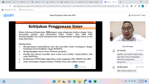 Berita FIKES Online- Fakultas Ilmu Kesehatan (FIKES) UIN Syarif Hidayatullah Jakarta melakukan rapat koordinasi secara online dengan seluruh dosen terkait pengisian data SISTER. Acara rapat langsung dibuka dengan pengarahan Dekan FIKES, Dr.apt. Zilhadia, M.Si. Pada Kesempatan tersebut Dekan FIKES menyampaikan agar para dosen menanggapi dengan serius himbauan untuk pengisian data SISTER ini dan melengkapi semua data yang sudah diisi dengan dokumen pendukung asli yang relevan. Kelengkapan pengisian data SISTER ini akan mempermudah proses migrasi ke Pangkalan Data Pendidikan Tinggi (PDDIKTI). Jum'at (18/3/2022).